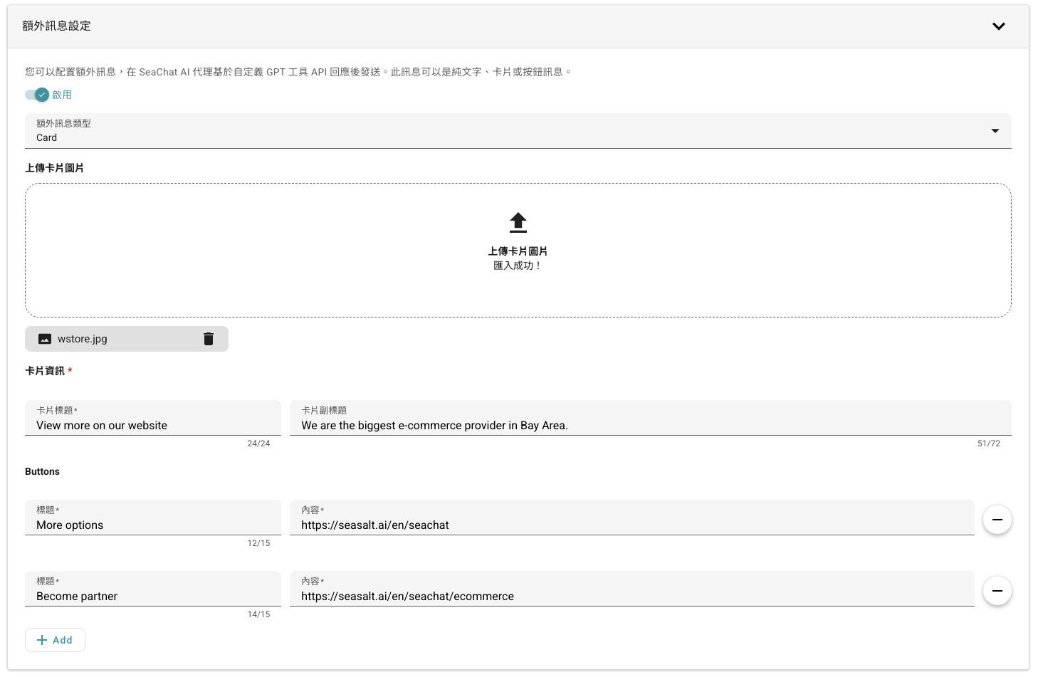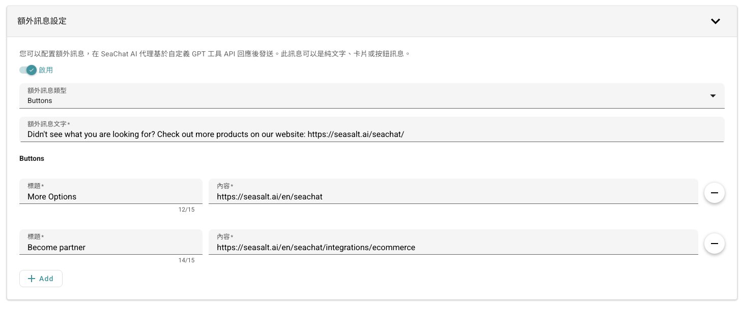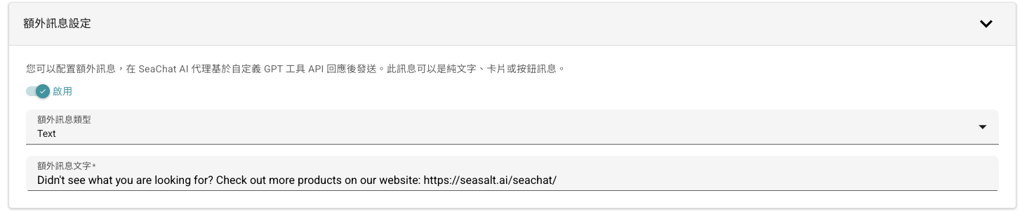 額外訊息設定 此部分適用於所有搜尋和顯示工具和圖片搜尋工具,允許您配置工具成功執行後應發送的額外訊息。每當您的 AI 助理使用客制 GPT 工具執行後的 API 回應進行回覆時,這些訊息會自動發送。此功能使您能夠在工具執行後提供後續指導、行動呼籲或其他資訊。