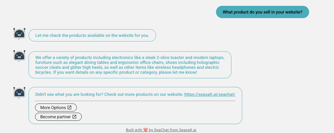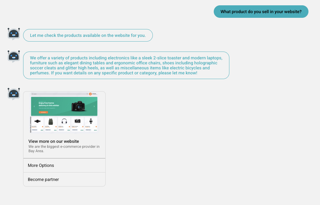 - 搜尋和顯示:允許 SeaChat 使用您的 API 執行外部搜索,並基於對話上下文獲取附加資訊。搜索結果將以純文本或卡片輪播形式顯示在 webchat 中。