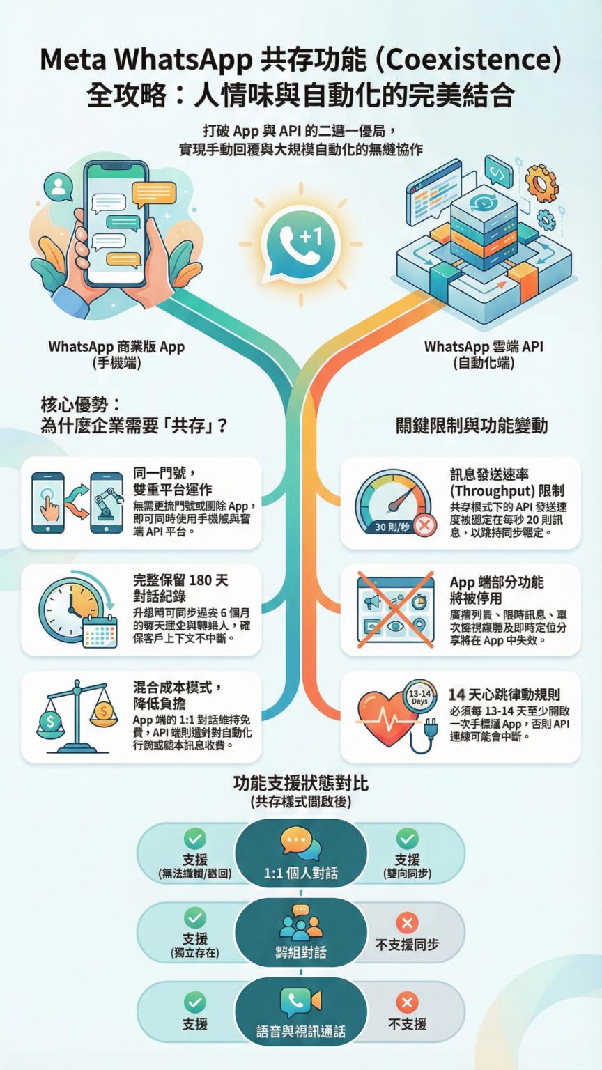 WhatsApp 共存模式 (WhatsApp Coexistence) 是 Meta 推出的全新功能,讓企業主能夠在保留手機上原生 WhatsApp 商業應用程式 (Business App) 的同時,獲得 WhatsApp 雲端 API (WhatsApp 商業平台) 的企業級功能。