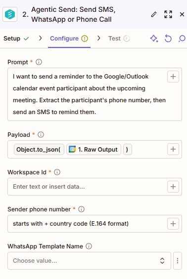 - 輸入完整 JSON 輸出: 將前一個觸發步驟的完整 JSON payload(例如 Google Calendar 的完整輸出)輸入到 Agentic Send 動作中。您不需要「逐一檢查每個小欄位」。